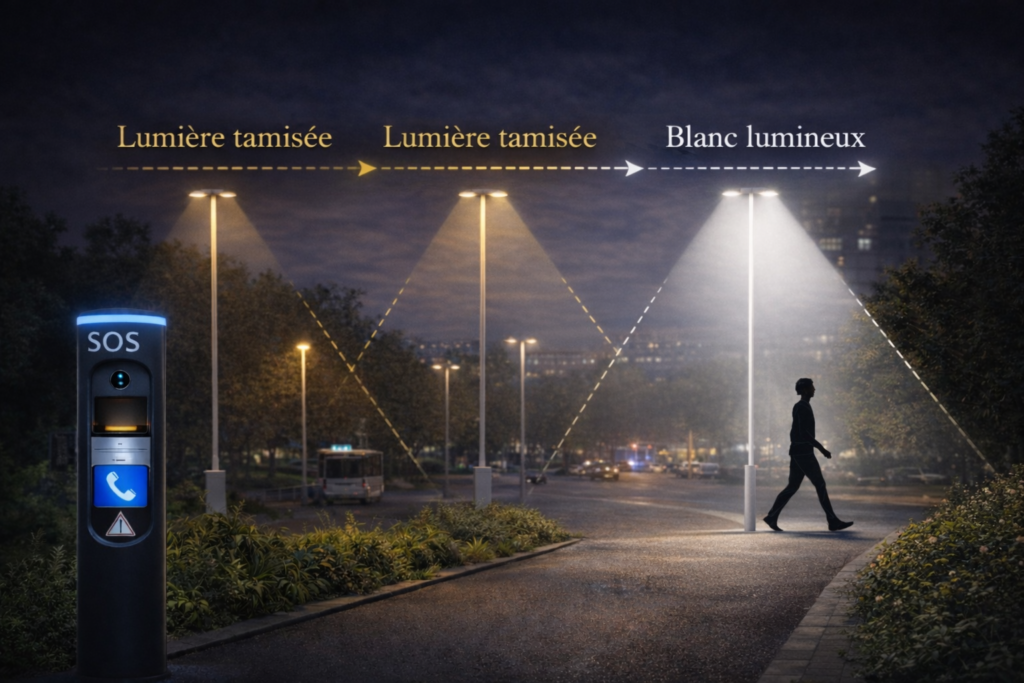 💡 Déploiement d’un éclairage public intelligent et adaptatif, capable de s’atténuer en l’absence d’activité et de s’intensifier automatiquement au passage des piétons, des cyclistes ou des véhicules, tout en supprimant les zones d’ombre (angles morts, recoins, haies, passages peu visibles), à la différence d’un éclairage fixe ou simplement programmé par horaires.