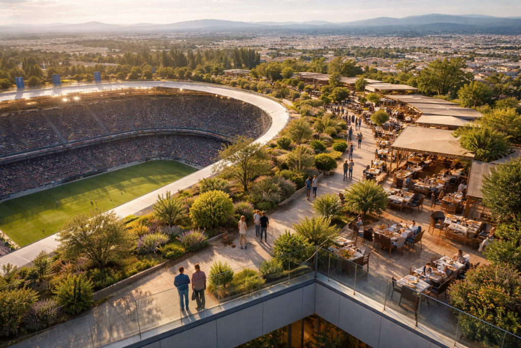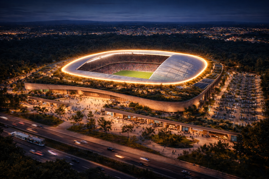 Un stade de 25 000 places, pensé pour le climat méditerranéen, visible depuis l’autoroute comme vitrine de Montpellier, et utile 365 jours par an grâce à un parc public sur le toit, des restaurants panoramiques, un musée emblématique et une Maison des sports ouverte toute l’année.