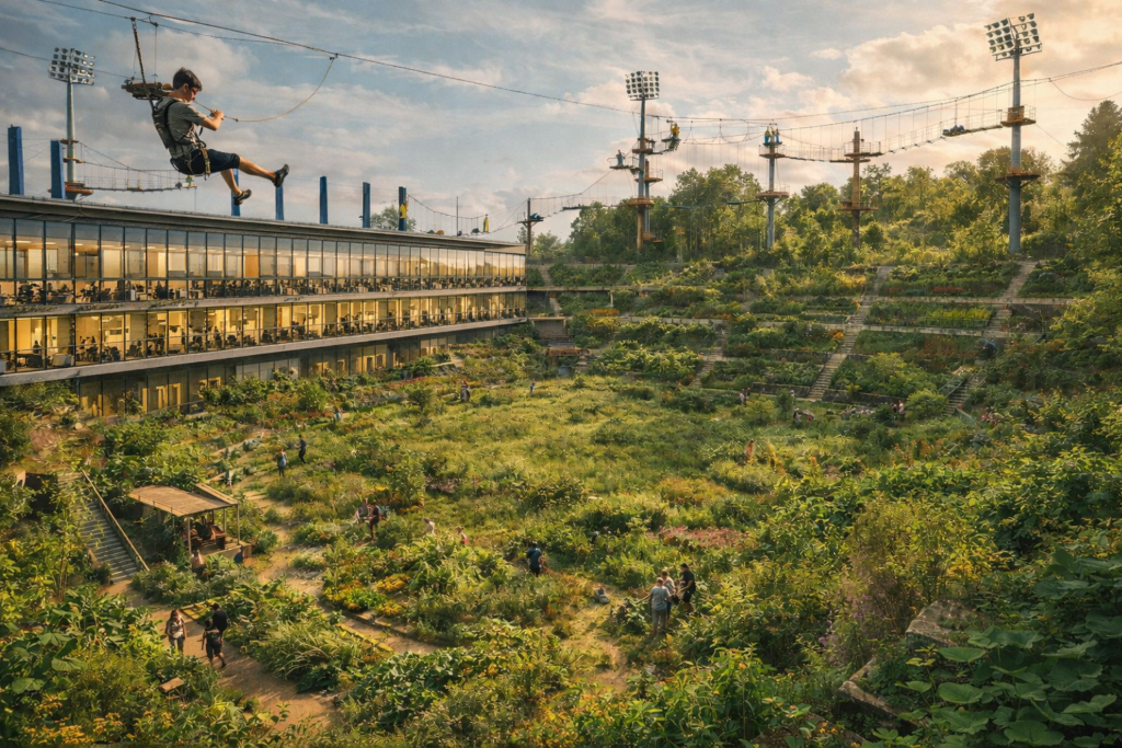 L’ancien stade devient un grand parc de permaculture, de loisirs nature, d’aventure et d’innovation écologique au cœur du quartier.