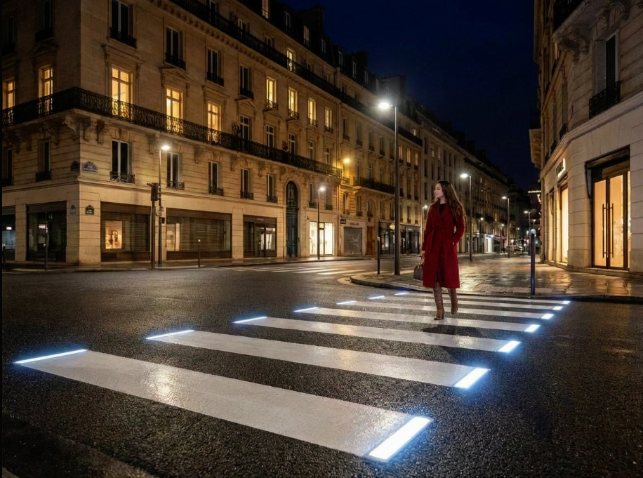 Le passage devient visible de loin, la voiture ralentit naturellement, le piéton traverse en sécurité. Pas besoin de feu. Pas besoin d’arrêter toute la circulation.